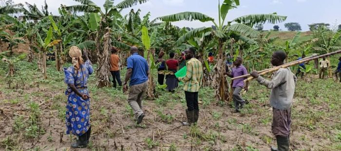 A Banana Plantation planted in the buffer zone eating into the wetland where the owner was advised by the project technical committee to dig terraces to stop nutrient run off into the wetland and most likely introduce coffee trees in the banana plantation for sustainable livelihoods.