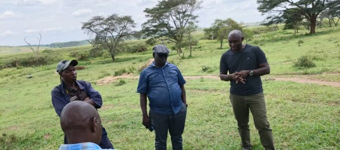 Seasonal farming in the buffer zones identified during the technical team field visit. The main cause of wetland shifts backwards due to silting. The NAPE ED Bwengye Rajabu Yusufu (blue shirt in the middle) and Kureeba David advised communities to maintain the recommended 30 metres from the highest water mark and they could use the buffer for cattle fodder.