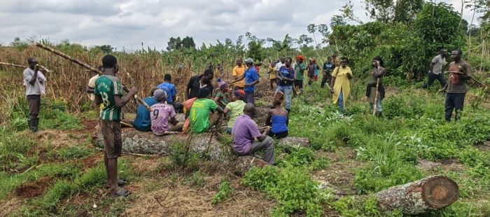 Evidence of riverine forests degradation. A big tree was cut to give way for farming and making charcoal which the chairman LC1 Katumba Julius (blue t shirt with a cup in the middle) which he discouraged in strongest terms.